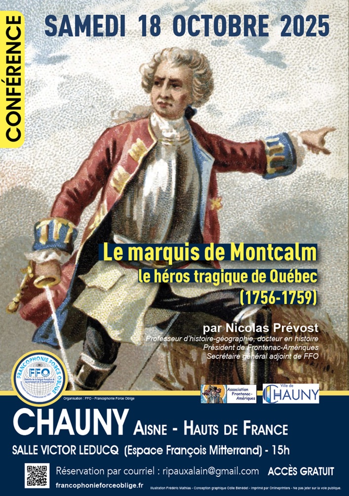 Dans le cadre de l’Assemblée générale annuelle de FFO, Nicolas Prévost, professeur d’histoire et président de Frontenac-Amériques, prononcera une conférence intitulée « Le Marquis de Montcalm (1712-1759), héros tragique de Québec » le samedi 19 octobre 2025 à 15 heures à l’Espace François Mitterrand, salle Victor Leducq, à Chauny (Aisne) - 12 boulevard Gambetta - 02300 Chauny.
