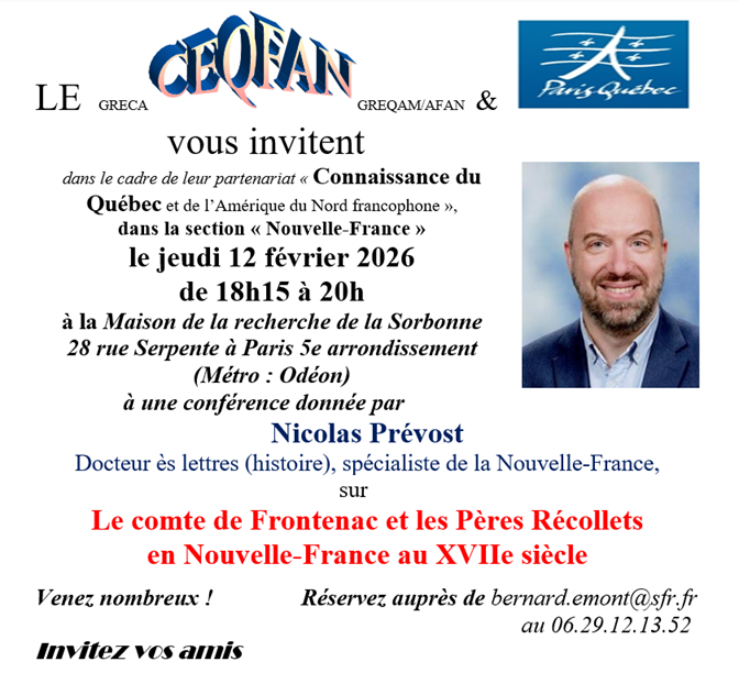 Sur invitation du GRECA-CEQFAN, Nicolas Prévost évoquera, lors d’une conférence, des relations entre le comte de Frontenac et les Pères Récollets lors d’une conférence le jeudi 12 février 2026 à la Maison de la Recherche de la Sorbonne à Paris 6e (28 rue Serpente) de 18h15 à 20h00.