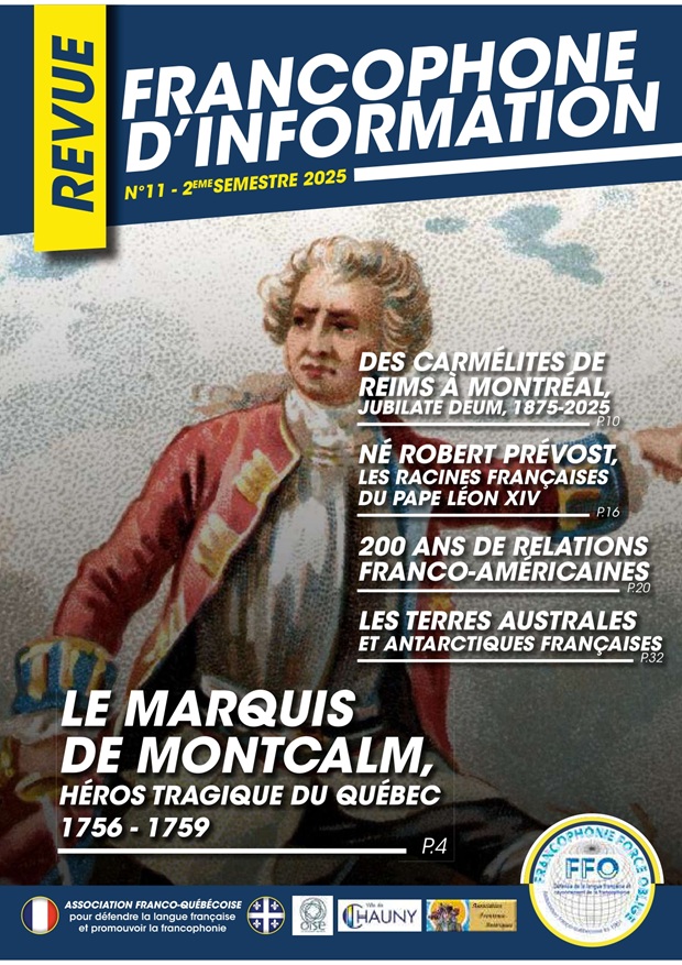 Sur 56 pages illustrées en couleur, ce nouveau numéro est notamment consacré au Marquis de Montcalm (1712-1759), aux Carmélites de Reims à Montréal, au nouveau pape Léon XIV né Robert Prévost, aux 200 ans de relations franco-américaines et aux Terres australes et Antarctiques françaises.
